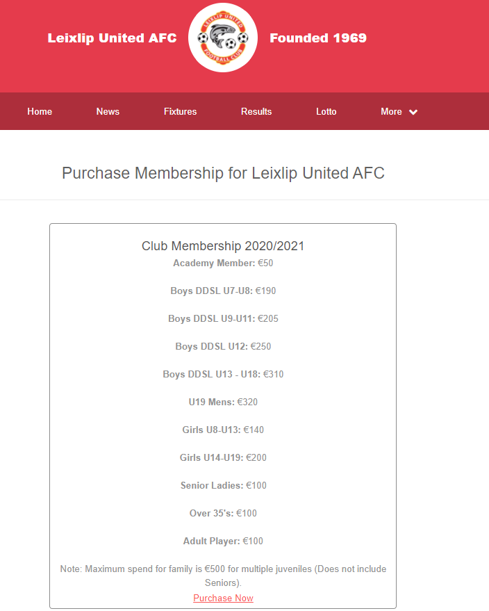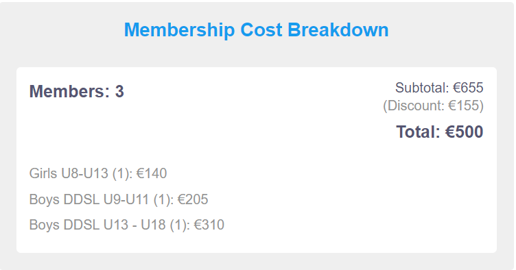 4. Fill in the child's details and add another member if you have more than one child registering with the club. You will see a breakdown of your fees and you can also pay in four monthly instalments. Families will automatically receive a disount if their total comes to €500.